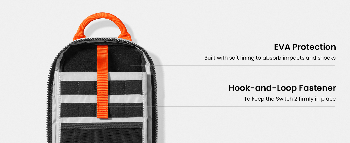 Ngăn bảo vệ riêng cho Switch 2 với kết cấu EVA chống sốc và lớp lót mềm mịn, đi kèm dây đai Velcro cố định thiết bị chắc chắn.