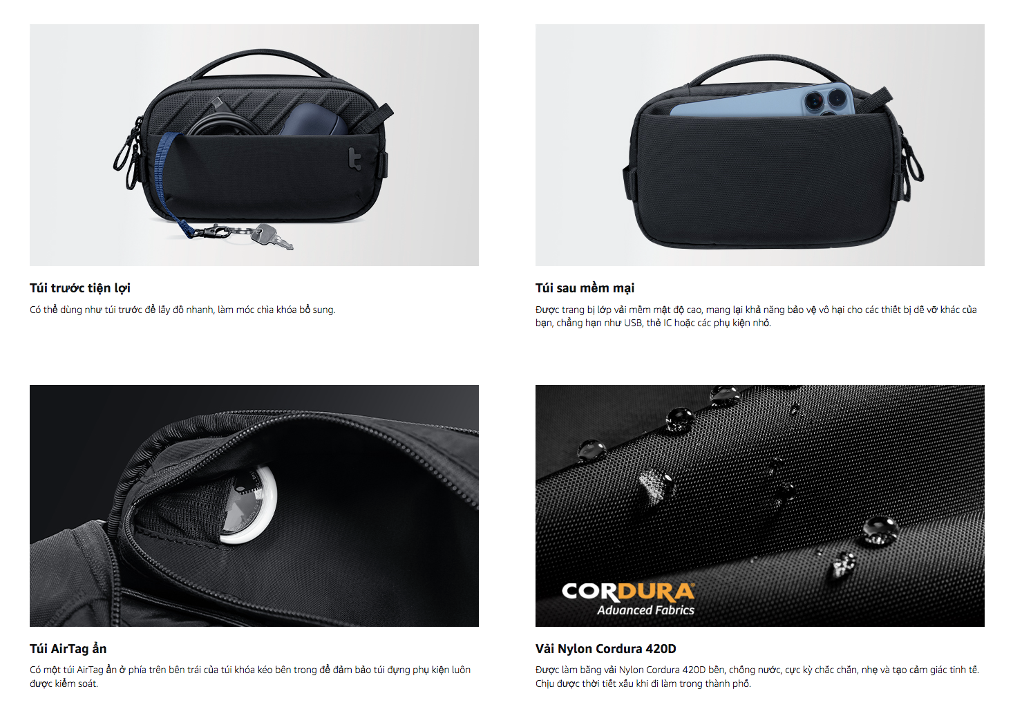 Sản phẩm sử dụng chất liệu Cordura 420D Nylon cao cấp, không chỉ chống nước hiệu quả mà còn đảm bảo độ bền vượt trội trong suốt thời gian sử dụng. Lớp vải mềm phía sau và cấu trúc bảo vệ chắc chắn giúp giữ an toàn tuyệt đối cho các thiết bị công nghệ và phụ kiện cá nhân.