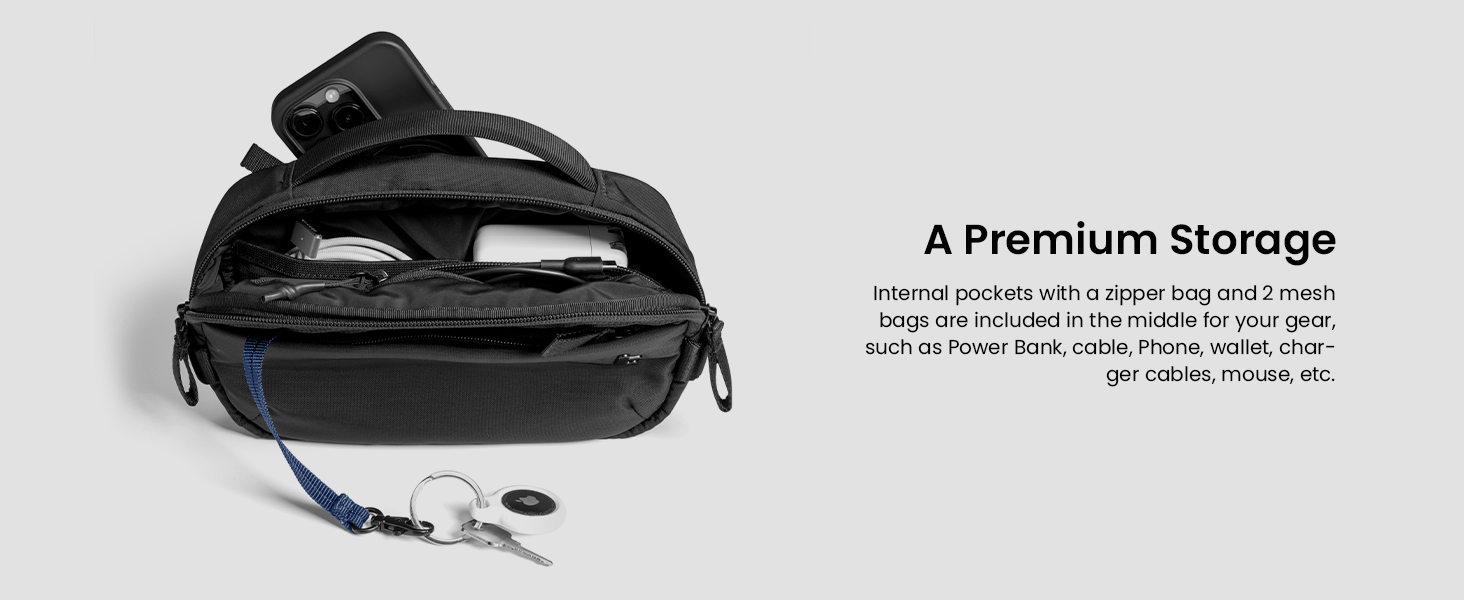 - Ngăn chính rộng rãi với túi khóa kéo và 2 ngăn lưới: Thoải mái đựng sạc dự phòng, cáp sạc, ví, điện thoại, chuột, tai nghe,…